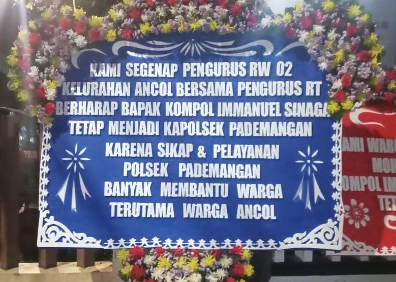 Karangan bunga tersebut berisi pesan dukungan dan harapan agar Kompol Immanuel Sinaga tetap melanjutkan tugasnya di wilayah Pademangan. Warga menilai kepemimpinannya selama ini mampu menjaga keamanan dan ketertiban masyarakat (kamtibmas) secara kondusif.